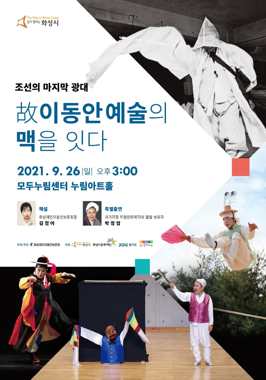 [2021 화성 예술가 활동지원 선정사업 공연 안내] 화성재인이동안보존회 <고 이동안 예술의 맥을 잇다> 작성자 관리자 작성일 2021년 9월 16일 9시 43분 35초 조회 441 이동안보존회 9월26일 공연 포스터.jpg [ Size : 321.38KB, Down : 97 ] 미리보기 다운로드 이동안보존회 9월26일 공연 포스터 경기도, 경기문화재단, 화성시, 화성문화재단이 후원한 2021 화성 예술가 활동지원 공모사업의 선정 공연이아래와 같이 진행되오니 관심있는 시민들의 많은 참여 부탁드립니다.<공연정보>공 연 명 : 조선의 마지막 광대 故이동안예술의 맥을 잇다예술단체 : 화성재인이동안보존회공연일시 : 2021.09.26.(일) 15:00공연장소 : 모두누림센터 누림아트홀티켓정보 : 전석 무료 목록보기