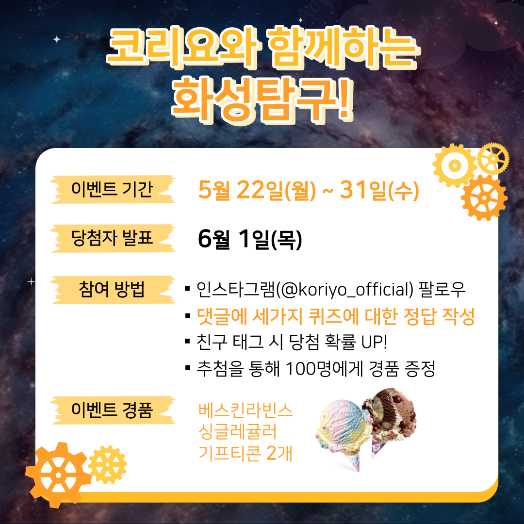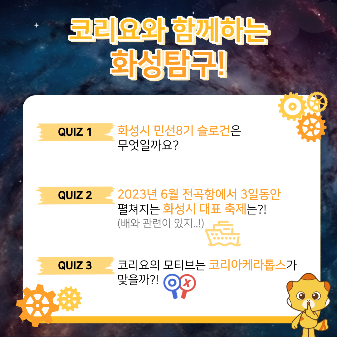 「문화가 있는 날 - 코리요」 화성탐구 SNS 이벤트 안내 작성자 관리자 작성일 2023년 5월 22일 13시 51분 9초 조회 456 5월 코리요 화성탐구1.png [ Size : 851.23KB, Down : 271 ] 미리보기 다운로드 5월 코리요 화성탐구1 5월 코리요 화성탐구2.png [ Size : 607.18KB, Down : 222 ] 미리보기 다운로드 5월 코리요 화성탐구2 5월 코리요 화성탐구3.png [ Size : 659.79KB, Down : 246 ] 미리보기 다운로드 5월 코리요 화성탐구3 목록보기