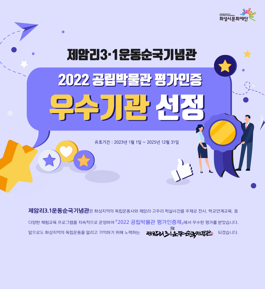 특히 제암리3.1운동순국기념관은 화성지역의 독립운동사와 제암리·고주리 학살사건을 주제로 전시, 학교연계교육, 다양한 시민대상 체험교육 프로그램을 지속적으로 운영하여 우수한 평가를 받았습니다.