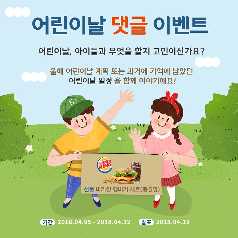 [아트홀] 어린이날 댓글 이벤트 작성자 최선영 작성일 2018년 4월 5일 17시 44분 3초 조회 877 어린이날_댓글_이벤트.jpg [ Size : 359.37KB, Down : 426 ] 미리보기 다운로드 *이벤트기간 : 4월 5일(목) ~ 4월 12일(목)*당첨발표 : 4월 16일(월)*당첨선물 : #버거킹 콰트로치즈와퍼세트 (5명) >> 이벤트 참여하러가기 https://www.facebook.com/hsarthall/photos/a.426212357752139.1073741828.426205214419520/552188658487841/?type=3&theater>> 어린이날 공연 정보 보러가기http://pf.kakao.com/_Mqxixhxl/10450286 목록보기