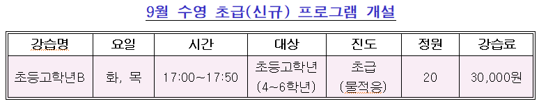 수영「기존프로그램」강습반 진도와 개인 레벨이 상이한 강습반에 등록시 환불처리 되오니(강습반 변경 불가) 등록 시 진도상담 바랍니다.