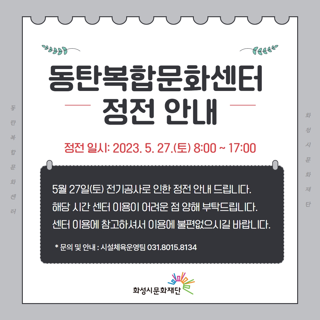 5월 27일 토요일 동탄복합문화센터 정전 안내 작성자 관리자 작성일 2023년 5월 23일 17시 37분 31초 조회 488 정전안내 5_27토 (1).jpg [ Size : 263.03KB, Down : 280 ] 미리보기 다운로드 정전안내 5_27토 (1) 5월 27일 토요일 동탄복합문화센터가 전기공사로 인해 오전 8시부터 오후 17시까지 정전됩니다.해당 시간 센터 이용이 어려운 점 양해 부탁드리며 센터 이용에 참고하셔서 이용에 불편 없으시길 바랍니다.*문의 및 안내 : 시설체육운영팀 031.8015.8134 목록보기