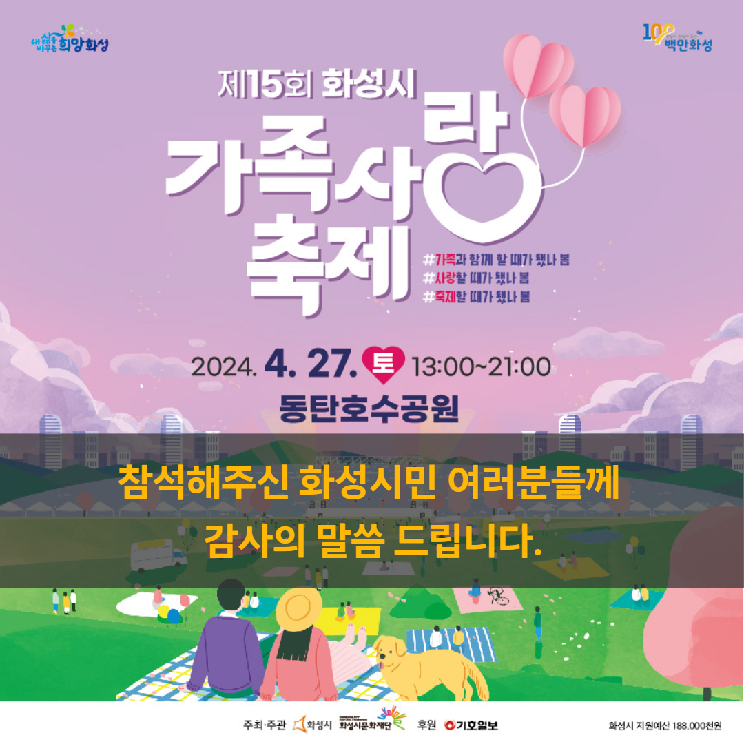 <제15회 화성시 가족사랑축제>에 참여해주신 많은 시민 여러분들께 감사의 말씀드립니다.