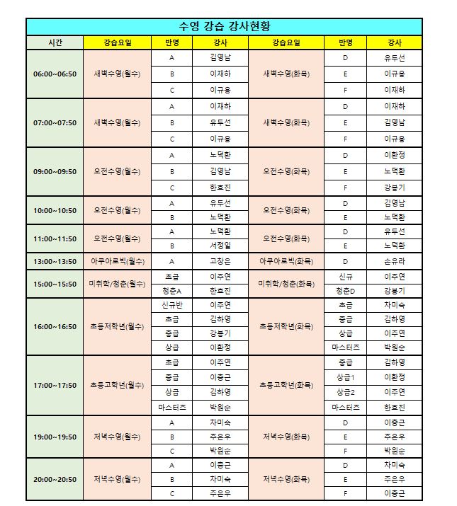 [스포츠] 수영 강습 강사배정 현황 작성자 관리자 작성일 2023년 12월 30일 17시 23분 58초 조회 1,480 수영강습 강사배정 현황.JPG [ Size : 99.28KB, Down : 425 ] 미리보기 다운로드 수영강습 강사배정 현황 목록보기