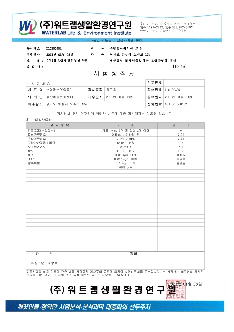 [스포츠] 2021년 1월 동탄복합문화센터 실내수영장 수질검사 성적서 작성자 관리자 작성일 2021년 1월 28일 17시 51분 41초 조회 657 2021년 1월 동탄복합문화센터 수영장 수(水) 검사 성적서.jpg [ Size : 313.75KB, Down : 450 ] 미리보기 다운로드 목록보기