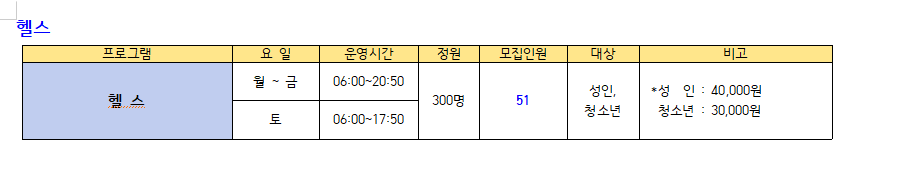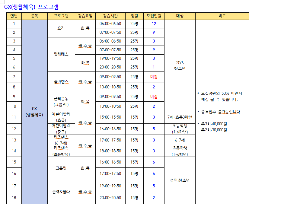 ● 모집프로그램: 수영(미취학.초등저학년.초등고학년, 월정기 자유수영), GX(생활체육), 헬스