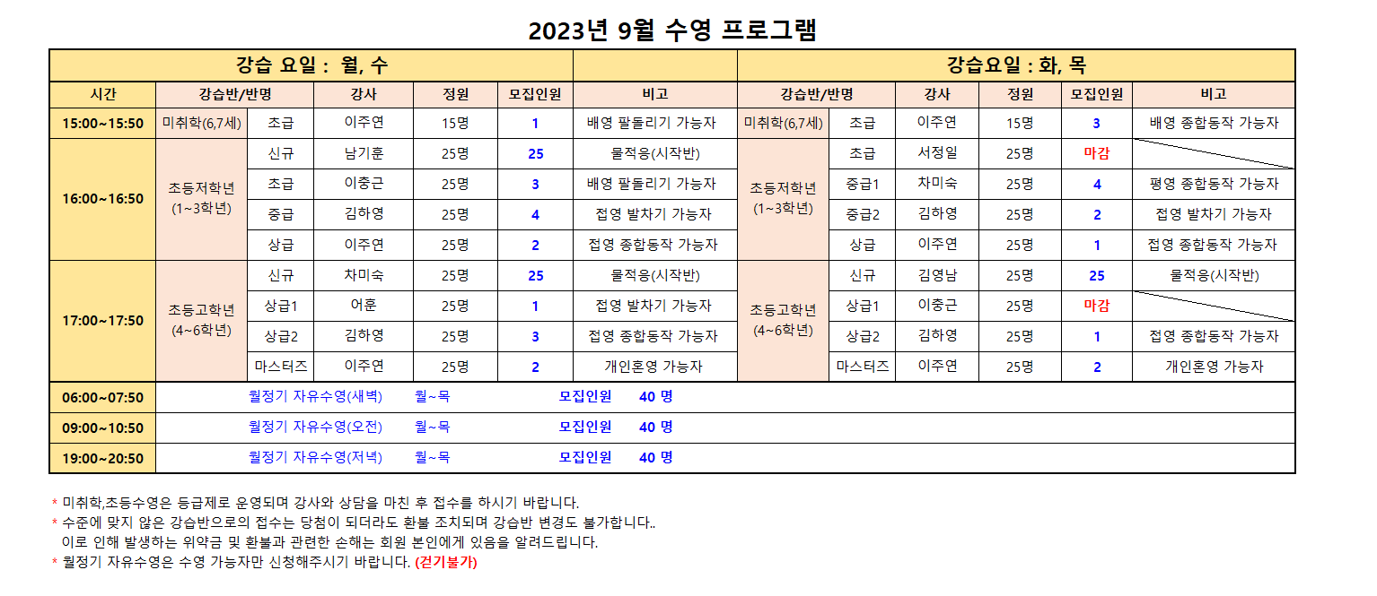 수준에 맞지 않은 강습반으로의 신규접수는 당첨이 되더라도 환불 조치되며 강습반 변경도 불가합니다..