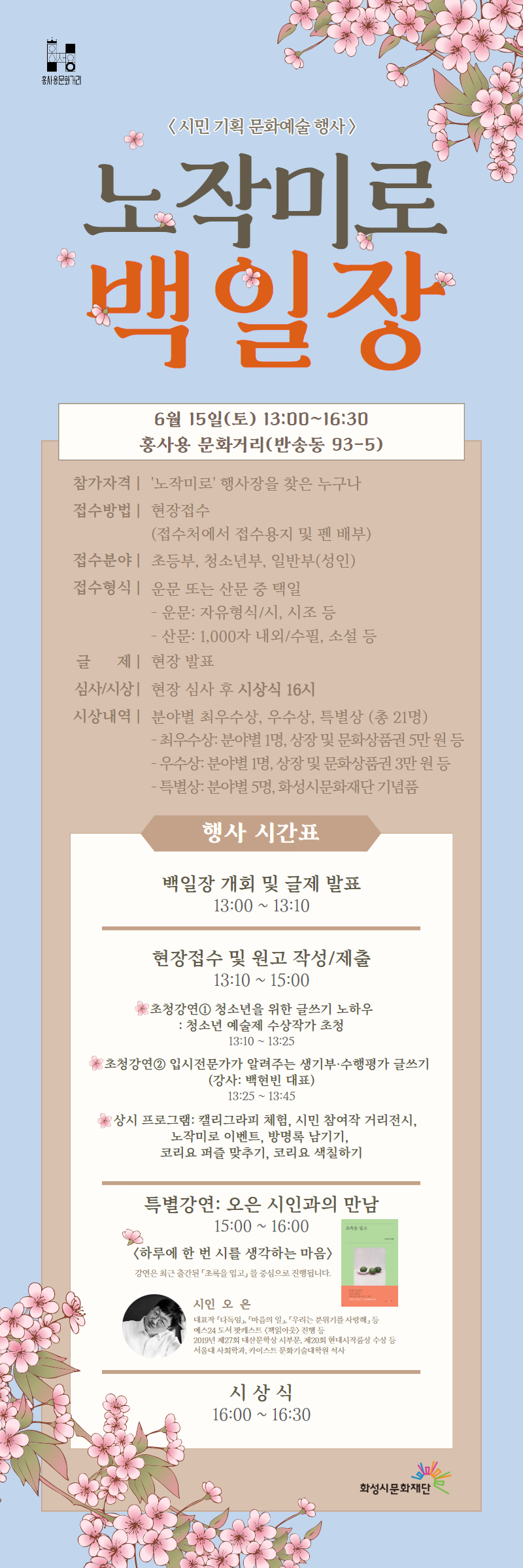 초등부, 중고등부, 일반부로 접수하실 수 있으며, 현장에서 발표하는 글제에 맞춰 운문 또는 산문을 작성해 제출하면 됩니다.