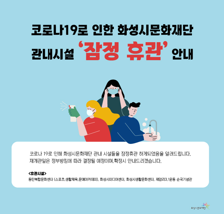 코로나 19로 인한 화성시문화재단 관내시설 잠정 휴관 안내 작성자 관리자 작성일 2020년 3월 24일 14시 5분 9초 조회 1,689 잠정휴관안내.jpg [ Size : 140.06KB, Down : 1,971 ] 미리보기 다운로드 코로나 19로 인해 화성시문화재단 관내 시설들을 잠정휴관 하게되었음을알려드립니다. 재개관일은 정부방침에 따라 결정될 예정이며,확정시 안내드리겠습니다. 목록보기