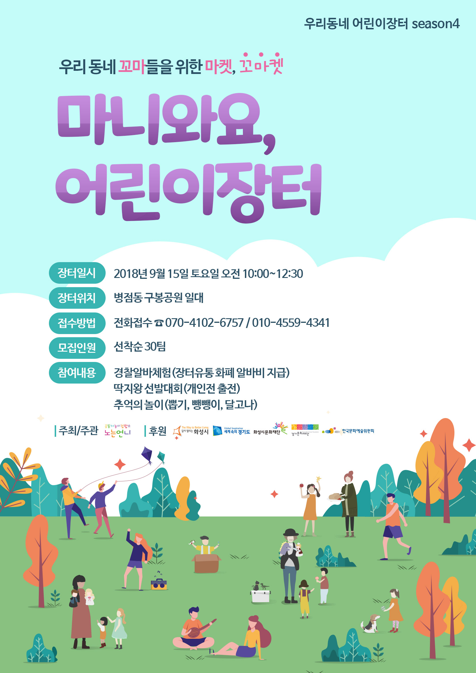 2018년도 지역예술활동지원 선정사업 '마니와요 어린이장터' 작성자 관리자 작성일 2018년 9월 6일 10시 50분 4초 조회 1,165 2018.9 어린이장터.jpg [ Size : 474.49KB, Down : 771 ] 미리보기 다운로드 목록보기