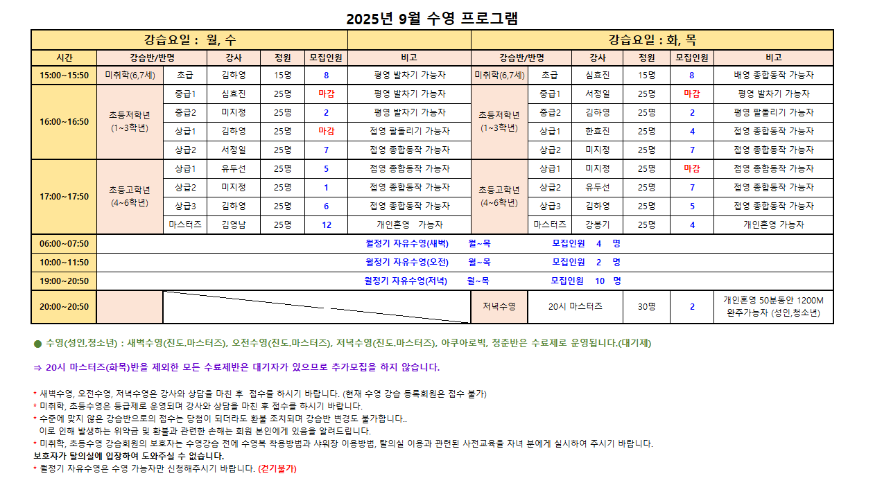 ※수영(성인,청소년) : 새벽수영(진도.마스터즈), 오전수영(진도.마스터즈), 저녁수영(진도.마스터즈), 아쿠아로빅, 청춘반은