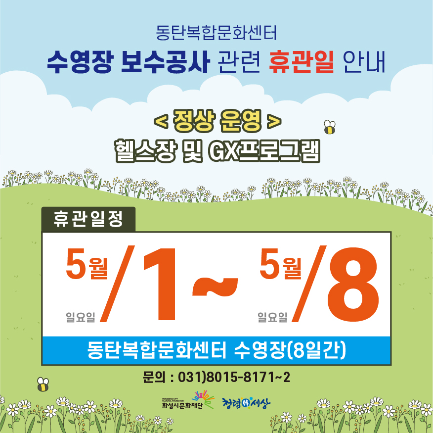 [스포츠] 동탄복합문화센터 수영장 보수공사 관련 휴관일 안내 작성자 관리자 작성일 2022년 4월 7일 15시 24분 47초 조회 1,597 image.jpg [ Size : 401.17KB, Down : 1,649 ] 미리보기 다운로드 image 동탄복합문화센터 수영장 보수공사 관련 휴관일 안내-휴관일자 : 5.1.(일) ~ 5.8.(일)-휴관업장 : 동탄복합문화센터 수영장-문의 : 031)8015-8171~2*헬스장 및 GX프로그램 정상운영* 목록보기