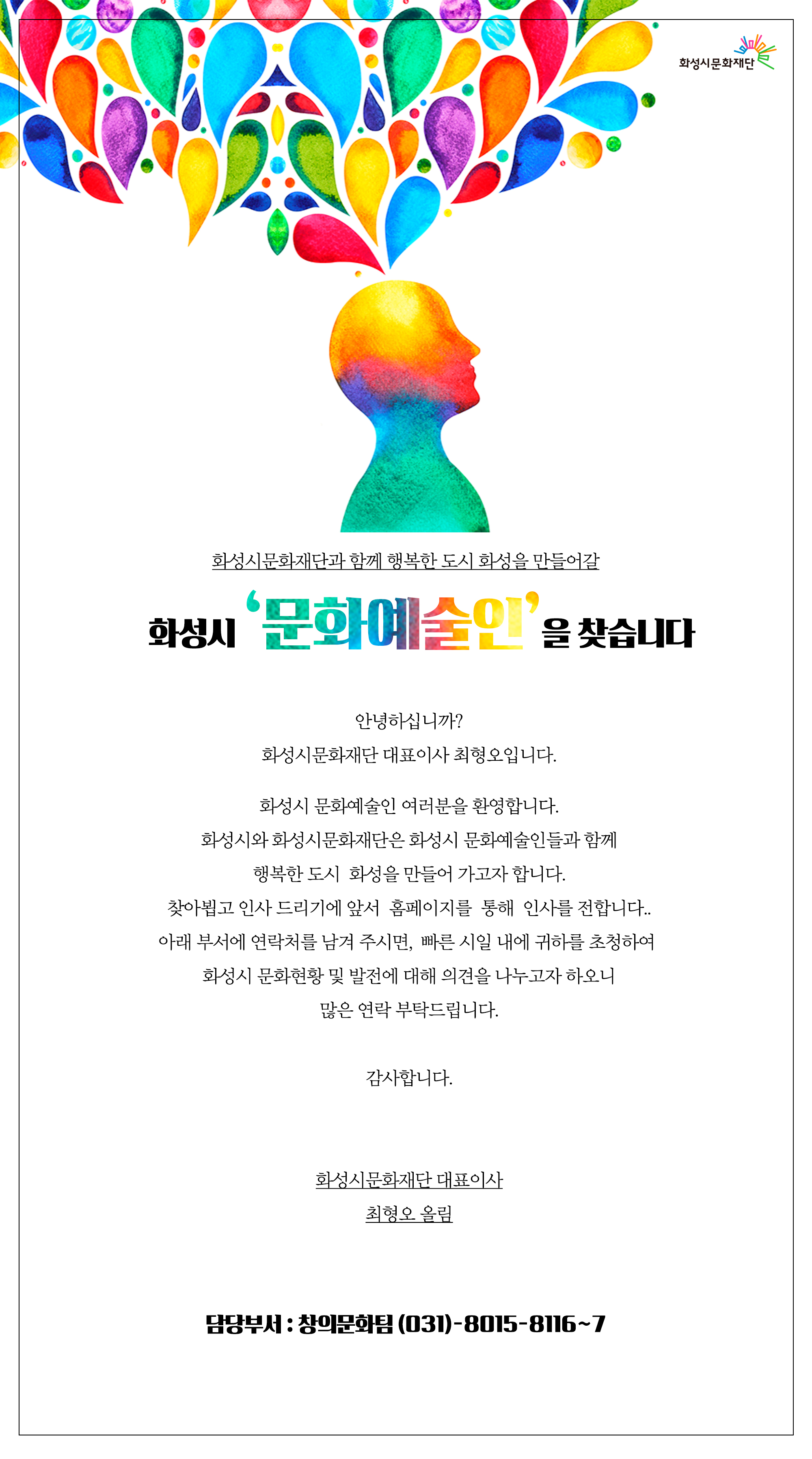 화성시문화재단과 함께 행복한 도시 화성을 만들어갈 화성시 '문화예술인'을 찾습니다.