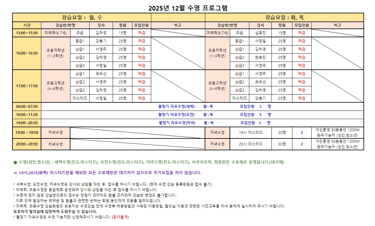 ※수영(성인,청소년) : 새벽수영(진도.마스터즈), 오전수영(진도.마스터즈), 저녁수영(진도.마스터즈), 아쿠아로빅, 청춘반은