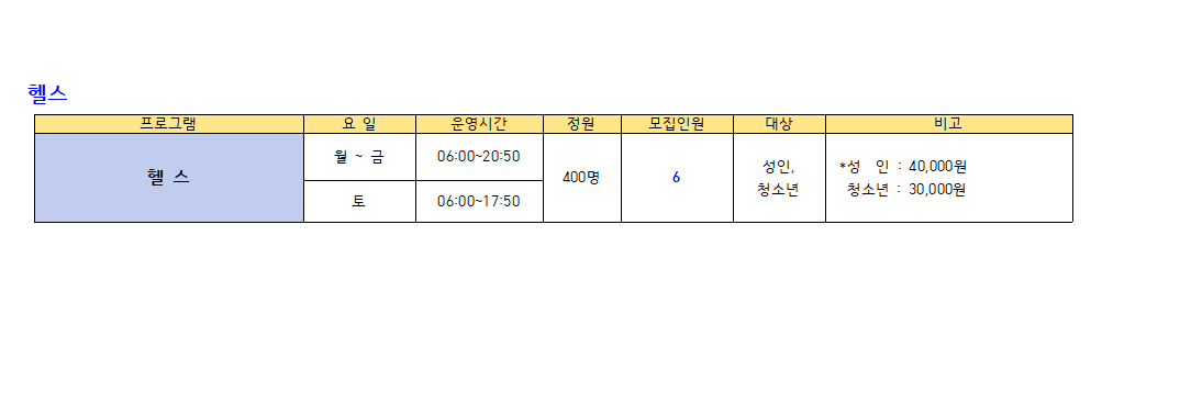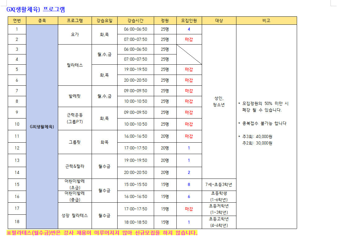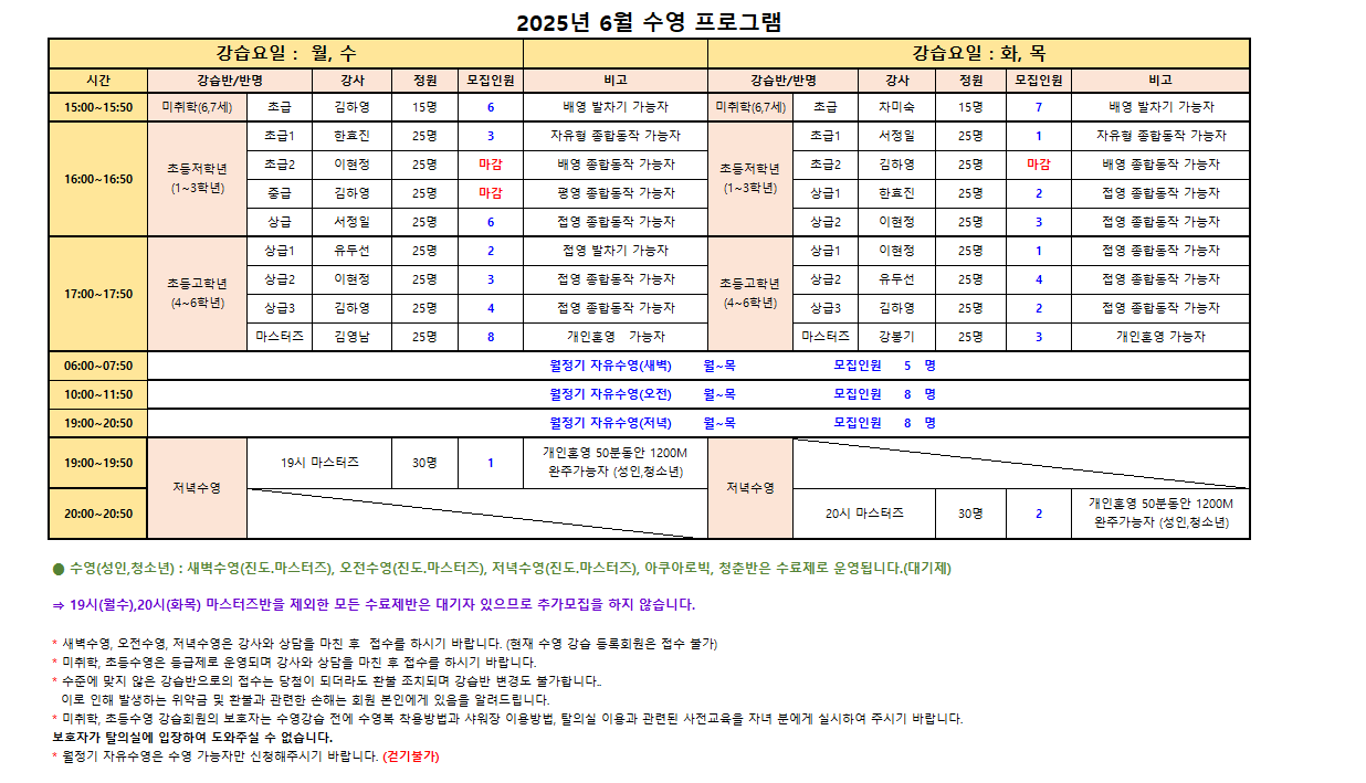 ※수영(성인,청소년) : 새벽수영(진도.마스터즈), 오전수영(진도.마스터즈), 저녁수영(진도.마스터즈), 아쿠아로빅, 청춘반은