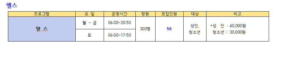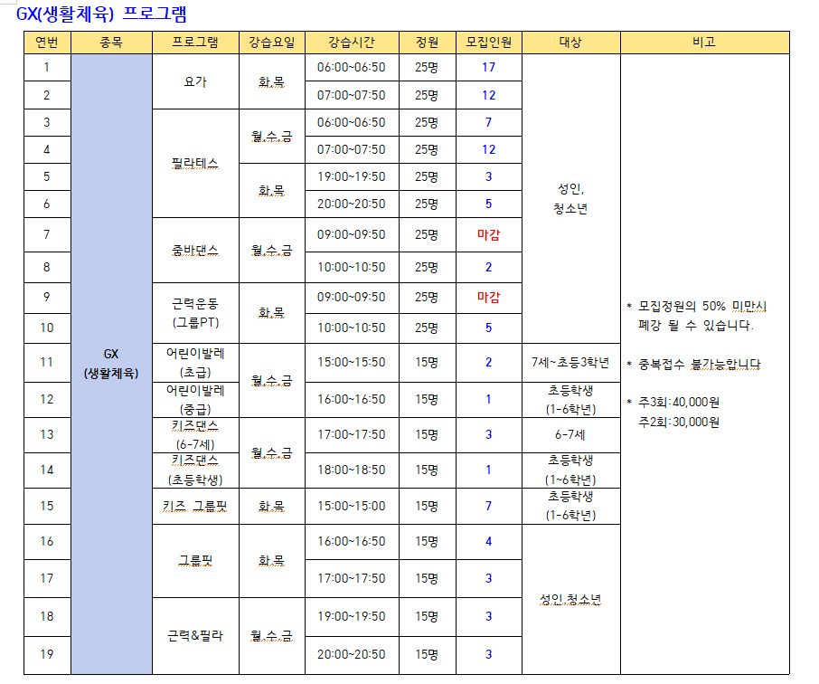● 모집프로그램: 수영(미취학.초등저학년.초등고학년, 월정기 자유수영), GX(생활체육), 헬스
