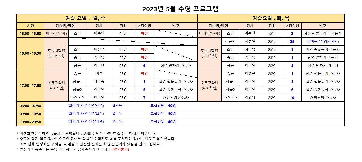수준에 맞지 않은 강습반으로의 신규접수는 당첨이 되더라도 환불 조치되며 강습반 변경도 불가합니다..