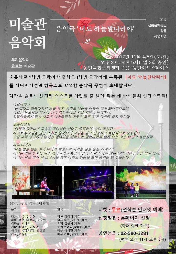 미술관 음악회 <음악극 ‘너도 하늘말나리야’> 공연 안내 작성자 방은지 작성일 2017년 10월 24일 15시 8분 12초 조회 2,125 슬라이드2.JPG [ Size : 140.83KB, Down : 335 ] 미리보기 다운로드 * 공연 신청 : http://gung.or.kr/g/museum/sub03.asp 목록보기