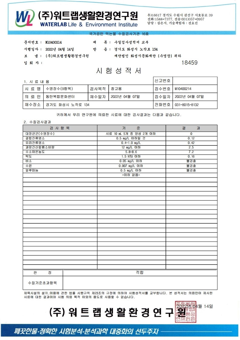 [스포츠] 2022년 4월 동탄복합문화센터 실내수영장 수질검사 성적서 작성자 관리자 작성일 2022년 4월 15일 10시 5분 21초 조회 977 동탄복합문화센터 4월 수영장 수(水) 검사 성적서.pdf_page_1.jpg [ Size : 401.54KB, Down : 879 ] 미리보기 다운로드 동탄복합문화센터 4월 수영장 수(水) 검사 성적서.pdf_page_1 목록보기