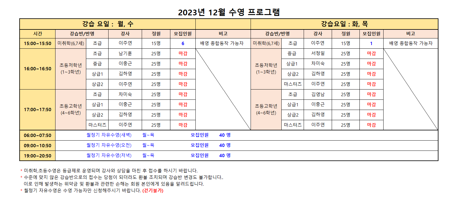 수준에 맞지 않은 강습반으로의 신규접수는 당첨이 되더라도 환불 조치되며 강습반 변경도 불가합니다..