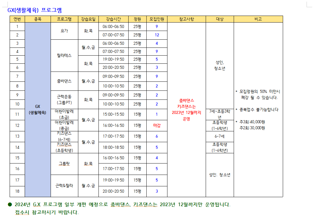 ● 2024년 G.X(생활체육) 프로그램 일부 개편 예정으로 줌바댄스, 키즈댄스는 2023년 12월까지 운영됩니다.