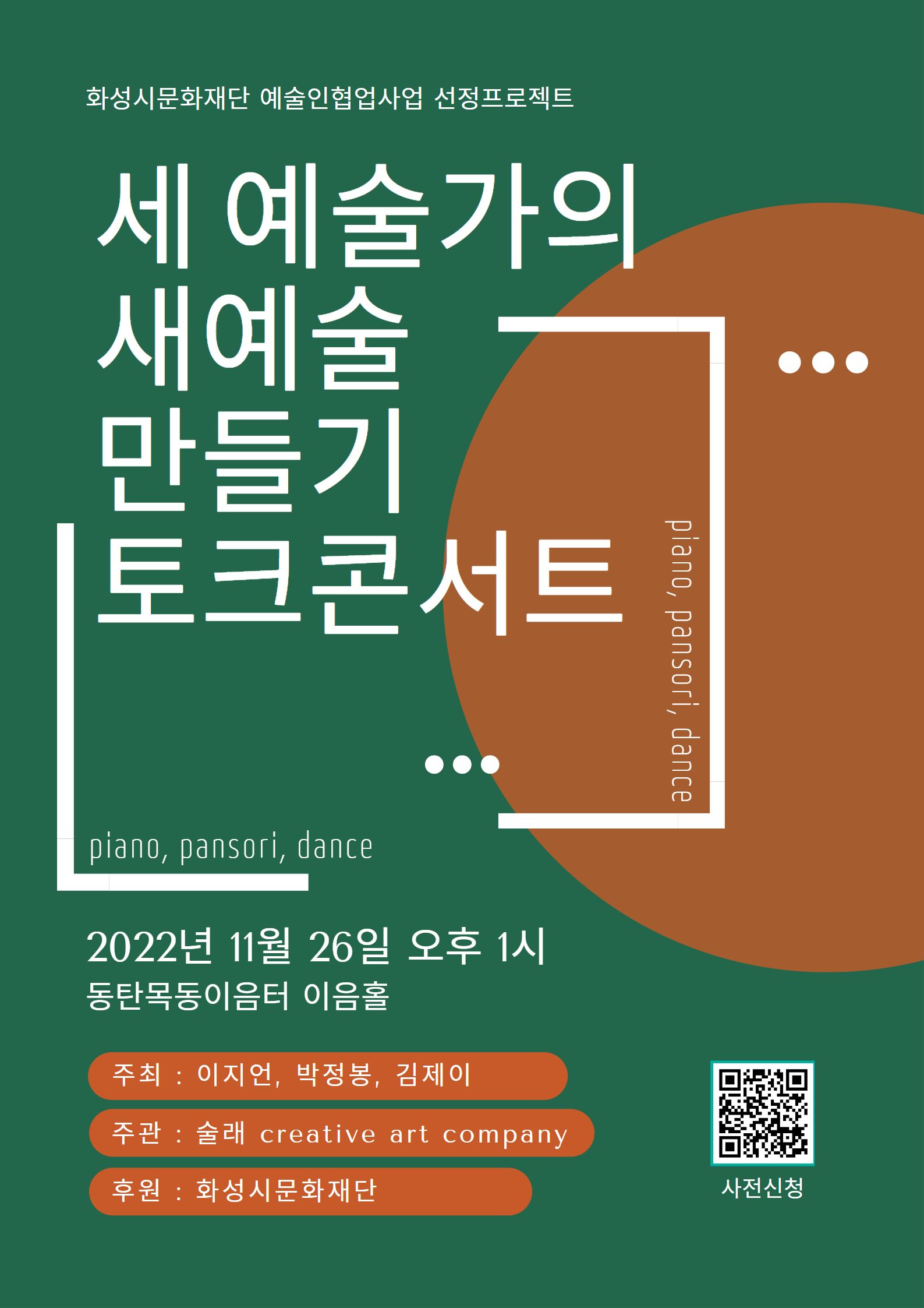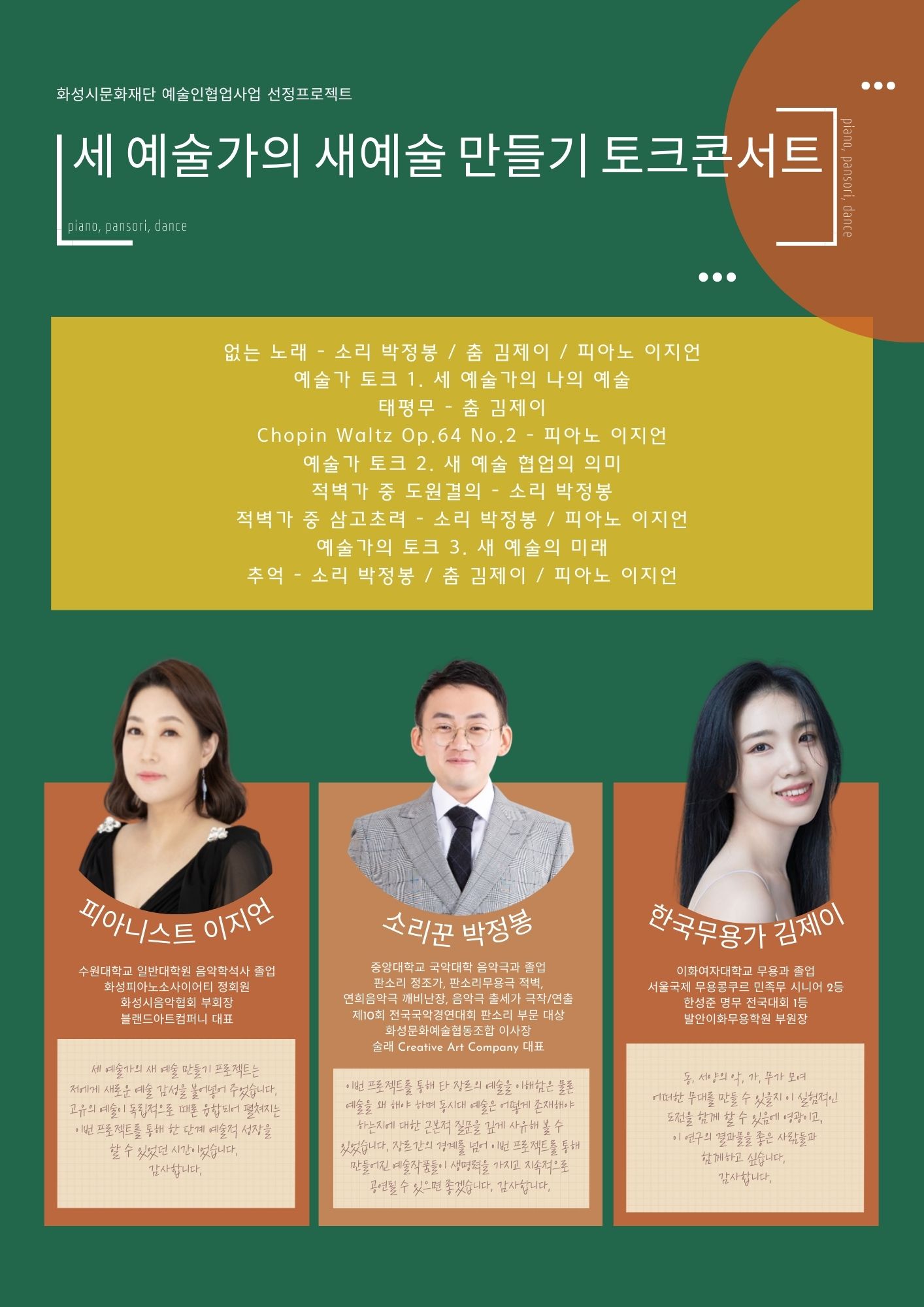 예술인협업사업 [세예술가의 새예술만들기] 토크콘서트 안내 작성자 관리자 작성일 2022년 11월 16일 15시 41분 25초 조회 703 포스터 이미지.jpg [ Size : 182.37KB, Down : 152 ] 미리보기 다운로드 포스터 이미지 전단 이미지.jpg [ Size : 250.22KB, Down : 151 ] 미리보기 다운로드 전단 이미지 화성시문화재단 예술인협업사업 [세예술가의 새예술만들기] 협업프로젝트!!판소리, 한국무용, 피아노의 협업을 통한 창작 토크 콘서트가 진행됩니다.화성시민 여러분의 많은 관람 바랍니다. 목록보기