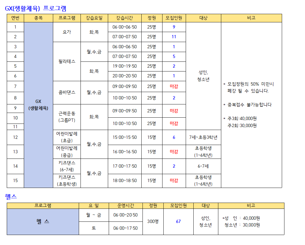 ▶헬스장 및 GX프로그램은 정상운영 됩니다.