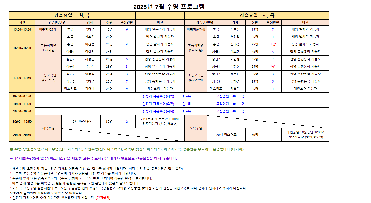 *미취학, 초등수영은 등급제로 운영되며 반드시 강사와 상담을 마친 후 접수를 하시기 바랍니다.