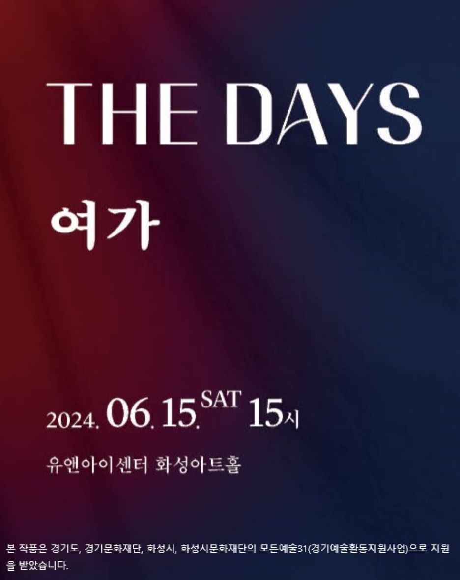 [2024년 모든예술31-화성] 6/15(토)여가_THE DAYS 작성자 관리자 작성일 2024년 5월 30일 16시 17분 7초 조회 596 블로그-인스타-페이스북홍보용.jpg [ Size : 62.72KB, Down : 366 ] 미리보기 다운로드 블로그-인스타-페이스북홍보용 noname01.png [ Size : 171.47KB, Down : 153 ] 미리보기 다운로드 noname01 2024 경기예술활동지원 모든예술31_화성 선정작여가 _ THE DAYS□ 공 연 명 : <THE DAYS>□ 단 체 명 : 여가□ 일 시 : 2024. 6 /15(토) 15:00 □ 장 소 : 유앤아이센터 화성아트홀 □ 접수방법 : 전화 및 QR코드 □ 문 의 : ㅇ1ㅇ - 이999 - 일287 <2024 경기예술활동지원 모든예술31_화성>에 선정되어 경기도와 경기문화재단, 화성시, 화성시문화재단의 후원을 받아 제작되었습니다. 목록보기