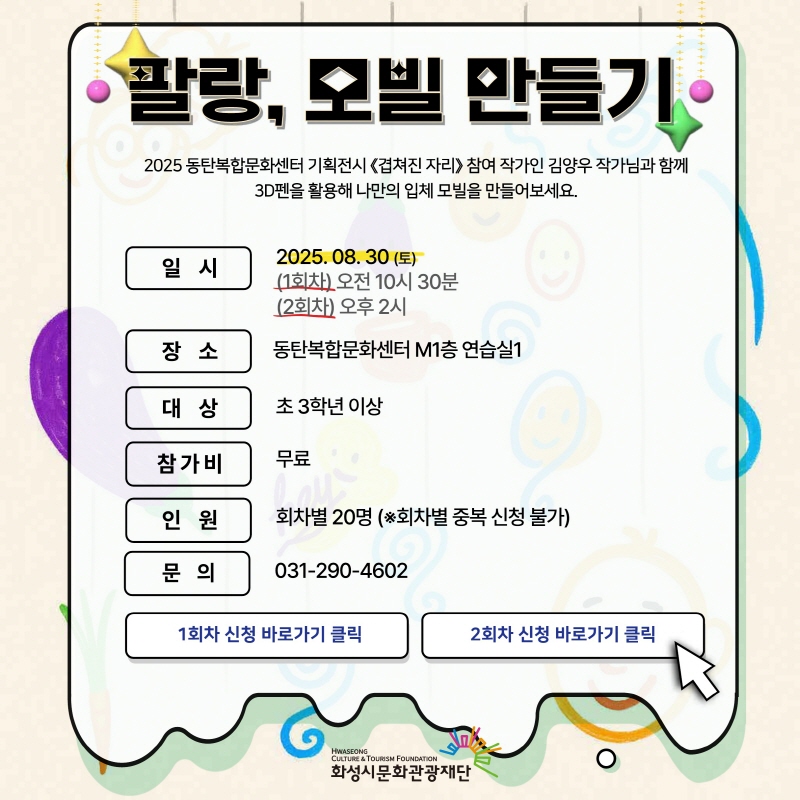 2025 동탄복합문화센터 기획전시 <겹쳐진 자리> 특별 연계프로그램 “팔랑, 모빌 만들기” 참여자 모집 작성자 관리자 작성일 2025년 8월 18일 14시 42분 51초 조회 338 mobile.jpg [ Size : 223.51KB, Down : 182 ] 미리보기 다운로드 mobile 목록보기