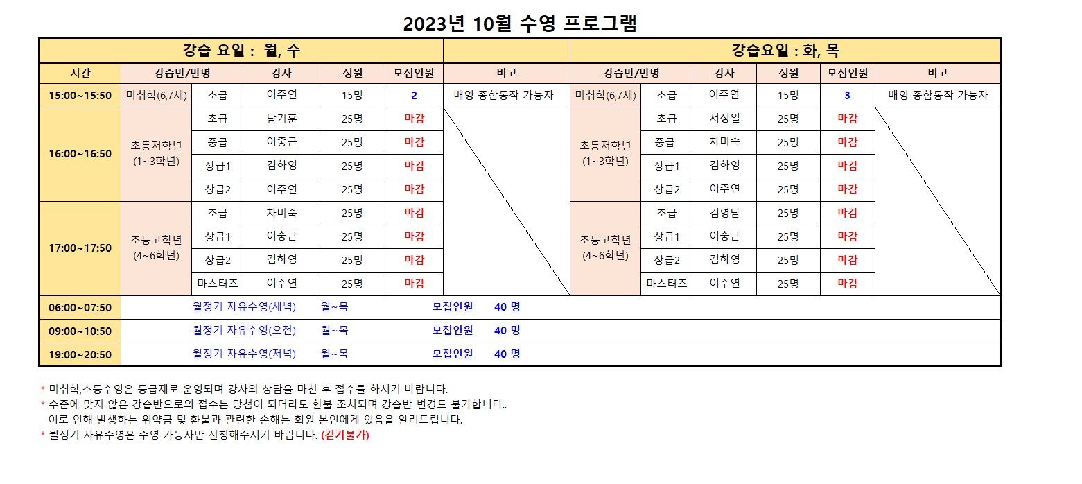 *월정기 자유수영은 수영가능자만 신청해주시기 바랍니다.(걷기불가)