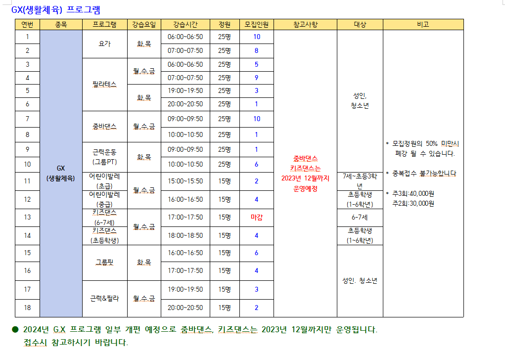 ● 2024년 G.X(생활체육) 프로그램 일부 개편 예정으로 줌바댄스, 키즈댄스는 2023년 12월까지 운영됩니다.