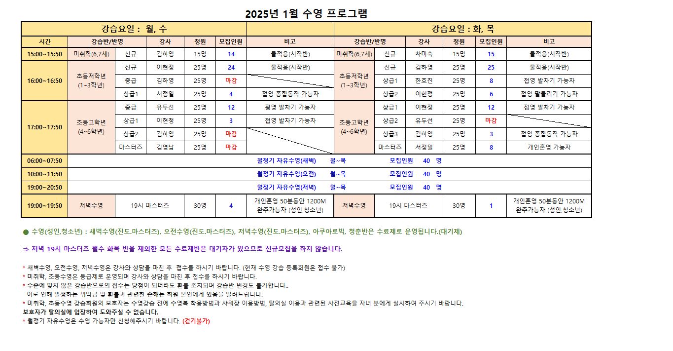● 수영(성인,청소년) : 새벽수영(진도.마스터즈), 오전수영(진도.마스터즈), 저녁수영(진도.마스터즈), 아쿠아로빅, 청춘반은