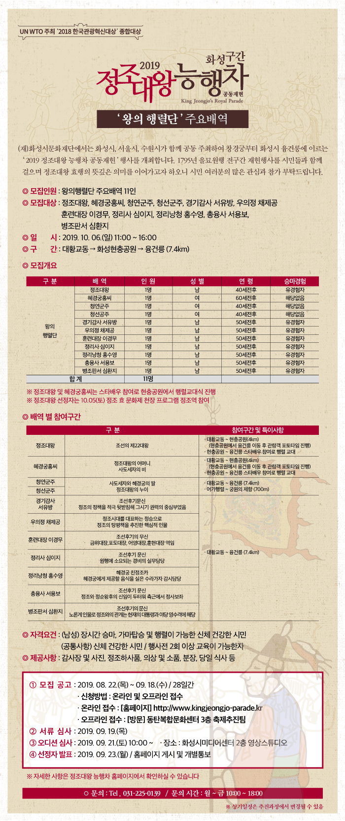 2019 정조대왕 능행차 공동재현 화성구간 참여자 모집 작성자 관리자 작성일 2019년 9월 11일 15시 46분 55초 조회 911 info.jpg [ Size : 1.06MB, Down : 416 ] 미리보기 다운로드 2019 정조대왕 능행차 왕의행렬단 모집* 자세한 사항은 붙임 참조.정조대왕 능행차 공동재현 홈페이지 바로가기>>http://hcf.or.kr/fmcstool 목록보기