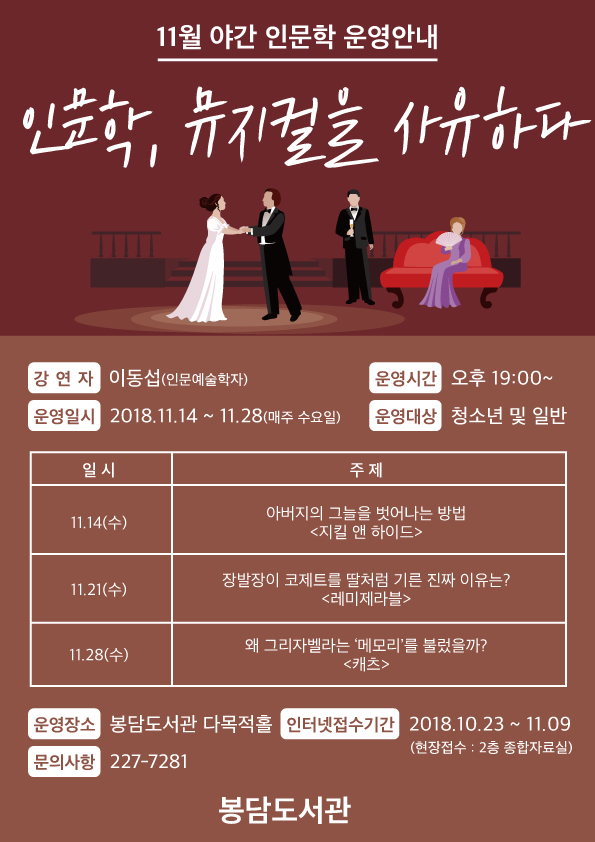【[기 타] 행사】인문학, 뮤지컬을 사유하다 장소 봉담도서관 다목적홀 기간 2018년 11월 14일 ~ 2018년 11월 14일 공연시간 티켓정보 관람등급 문의 031-227-7281 인문학, 뮤지컬을 사유하다봉담도서관 다목적홀031-227-7281 뮤지컬.png [ Size : 20.03KB, Down : 255 ] 미리보기 다운로드 a4-11월-야간-인문학1.jpg [ Size : 218.54KB, Down : 270 ] 미리보기 다운로드 a4-11월-야간-인문학1.jpg [ Size : 218.54KB, Down : 388 ] 미리보기 다운로드 목록보기