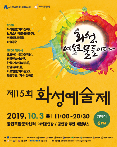 1. (취소)제 15회 화성예술제,장소:동탄복합문화센터 야외공연장,기간:2019년 10월 3일~2019년 10월 3일