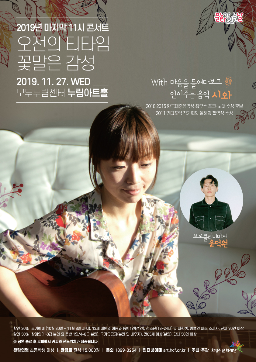【[공 연]기획공연】오전의 티타임 꽃말은 감성〈시와X윤덕원〉 장소 누림아트홀 기간 2019년 11월 27일 ~ 2019년 11월 27일 공연시간 70분 티켓정보 전석 15,000원 관람등급 초등학생 이상 문의 1899-3254 티켓오픈 10월 30일(수) 오전 10시 11월 11시콘서트 80x120-홈페이지-외부.jpg [ Size : 1.33MB, Down : 161 ] 미리보기 다운로드 11시콘서트-11월-포스터a2(90장)ol.jpg [ Size : 697.32KB, Down : 159 ] 미리보기 다운로드 11월_11시콘서트-상세페이지ol.jpg [ Size : 3.23MB, Down : 1,478 ] 미리보기 다운로드 목록보기