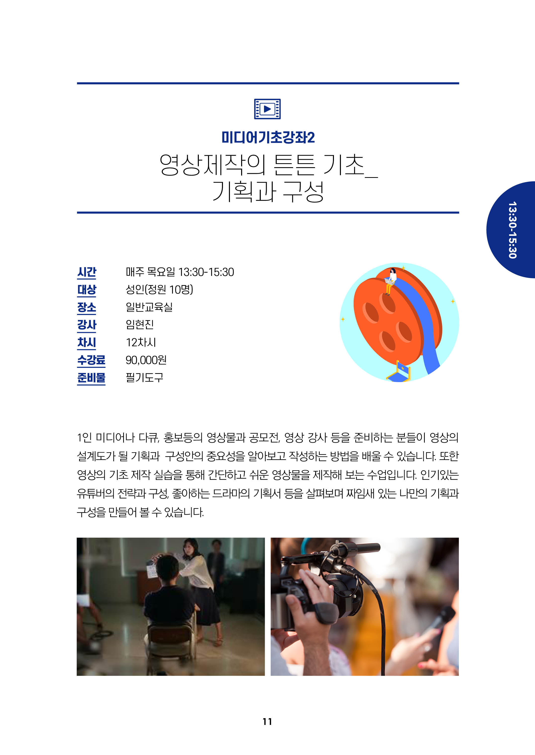 미디어기초강좌2/영상제작의 튼튼기초_기획과 구성/시간:매주 목요일 13:30-15:30, 대상:성인(정원10명), 장소:일반교육실, 강사:임현진, 차시:12차시, 수강료:9만원, 준비불:필기도구/