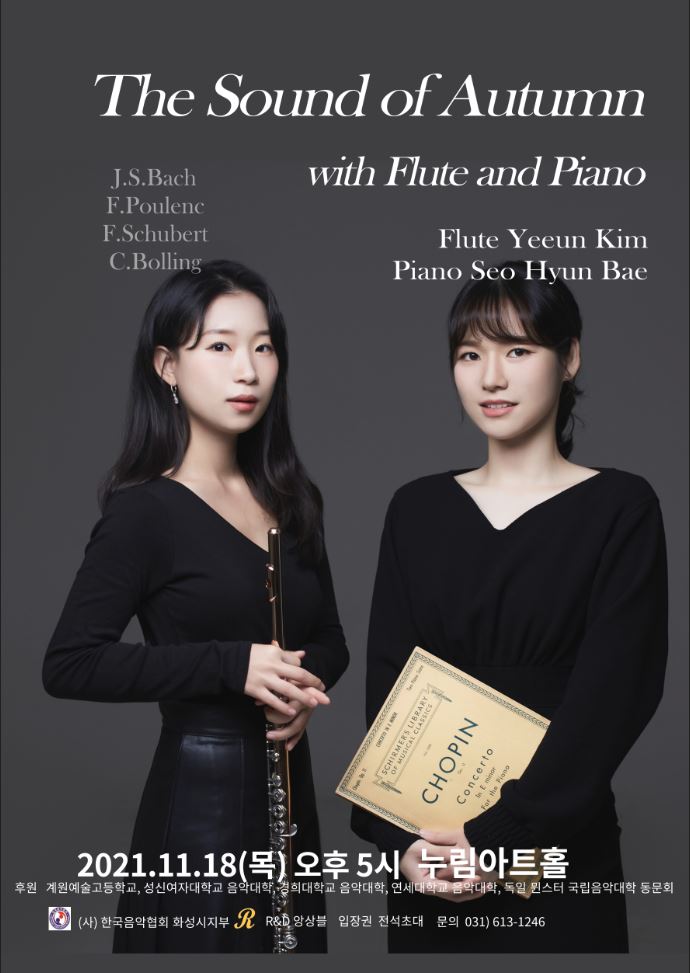 【[공 연]대관공연】The Sound of Autumn with Flute and Piano 장소 모두누림센터 누림아트홀 기간 2021년 11월 18일 ~ 2021년 11월 18일 요일 목 공연시간 오후 5시 (소요시간 75분) 티켓정보 전석초대 관람등급 7세 이상 문의 031-613-1246 공연문의 : 031-613-1246 김예은플루트 포스터.JPG [ Size : 76.79KB, Down : 92 ] 미리보기 다운로드 김예은플루트 포스터 김예은플루트 포스터.JPG [ Size : 76.79KB, Down : 66 ] 미리보기 다운로드 김예은플루트 포스터 김예은플루트 포스터.JPG [ Size : 76.79KB, Down : 202 ] 미리보기 다운로드 김예은플루트 포스터 목록보기
