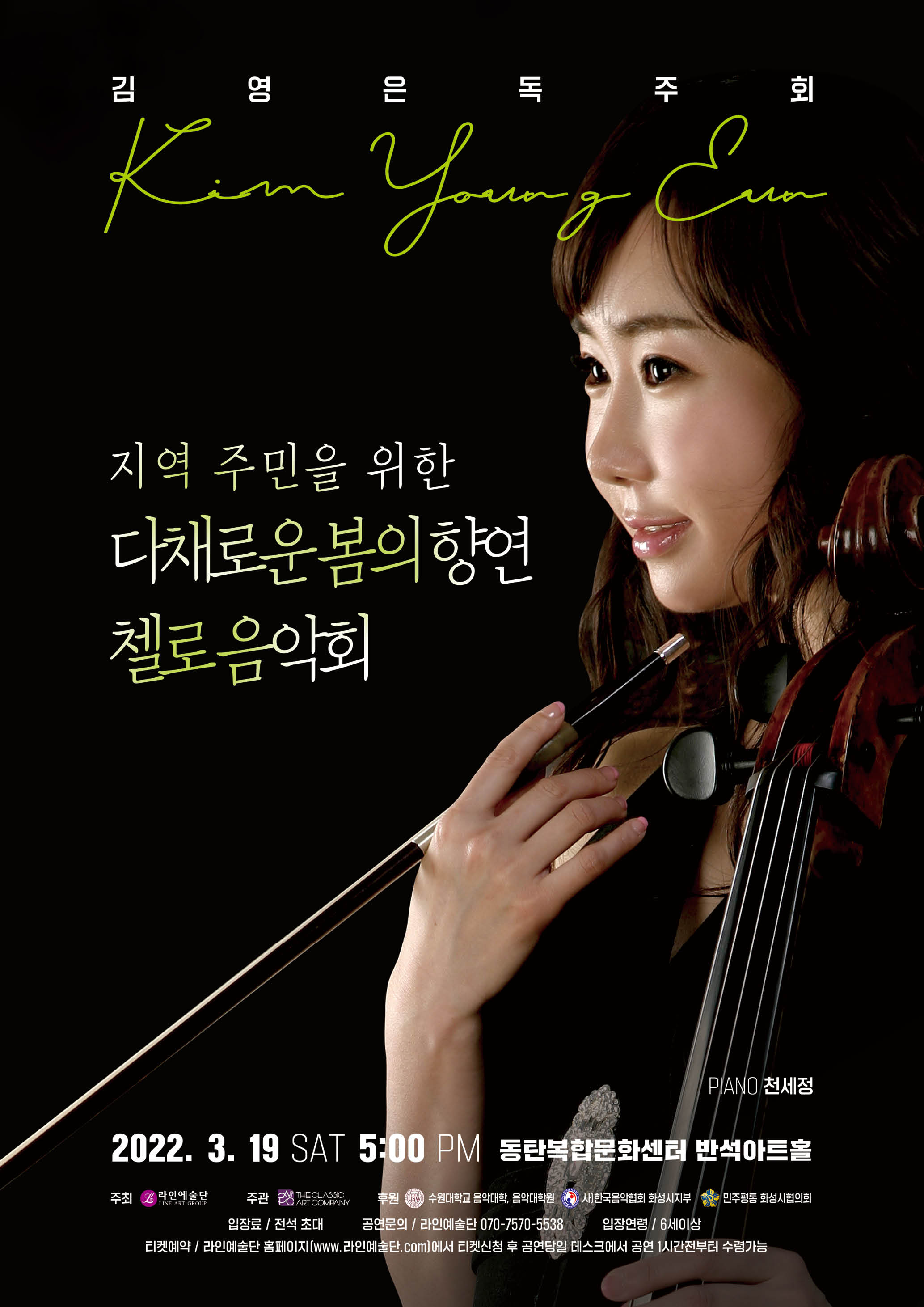【[공 연]대관공연】지역주민을 위한 다채로운 봄의 향연 첼로음악회 장소 동탄복합문화센터 반석아트홀 기간 2022년 3월 19일 ~ 2022년 3월 19일 요일 토 공연시간 2022년 3월 19일(토) 17:00 티켓정보 전석 무료 관람등급 6세 이상 문의 070-7570-5538 . 앞면.jpg [ Size : 371.83KB, Down : 77 ] 미리보기 다운로드 앞면 앞면.jpg [ Size : 371.83KB, Down : 122 ] 미리보기 다운로드 앞면 뒷면.jpg [ Size : 531.85KB, Down : 147 ] 미리보기 다운로드 뒷면 목록보기