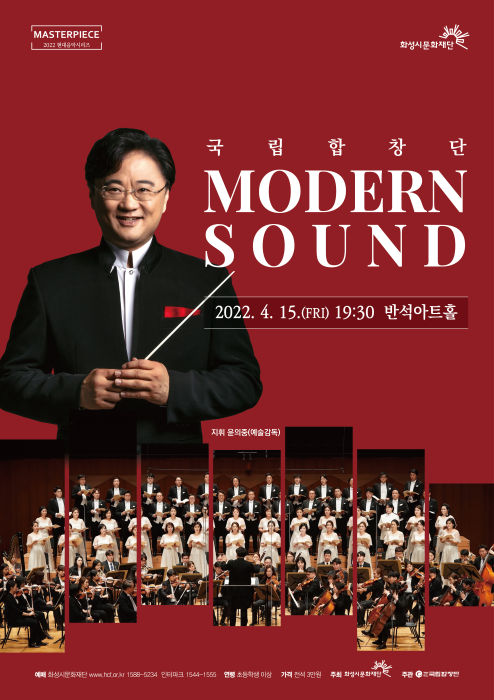 ![[마스터피스 2022 현대음악시리즈1] 국립합창단 <Modern Sound> 동탄복합문화센터 반석아트홀 2022년 4월 15일 ~ 2022년 4월 15일 금 19:30(총 70분, 인터미션 15분 포함) 전석 3만원 초등학생 이상 관람가 1588-5234 국립합창단 Modern Sound 2022. 4. 15.(FRI) 19:30 반석아트홀 예매 화성시문화재단 www.hcf.or.kr 1588-5234 인터파크 1544-1555 ↔ 연령 초등학생 이상 ↔ 가격 전석 3만원↔주최 화성시문화재단 주관 국립합창단 지휘 윤의중(예술감독) 마스터피스 2022 현대음악 시리즈 위대한 작곡가들의 명작을 실력 있는 음악가들의 연주로 만나볼 수 있는 클래식 공연 현대음악의 흐름을 소개하고 현대음악의 활성화에 기여하고자 기획된