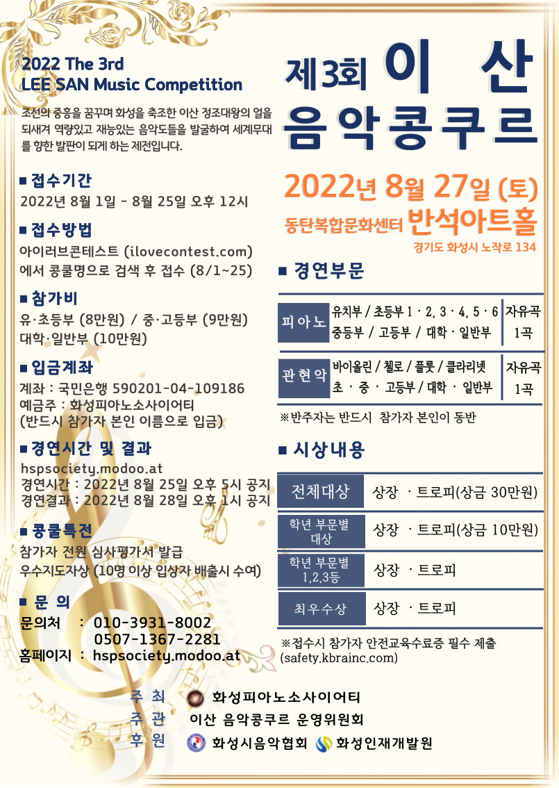 1. 제 3회 이산음악콩쿠르,장소:동탄복합문화센터 반석아트홀,기간:2022년 8월 27일~2022년 8월 27일