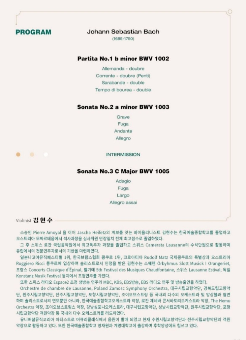 【[공 연]대관공연】바이올리니스트 김현수 독주회 - 바흐 무반주 바이올린 소나타와 파르티타 장소 동탄복합문화센터 반석아트홀 기간 2022년 3월 3일 ~ 2022년 3월 3일 요일 목 공연시간 2022년 3월 3일(목) 19:30 (소요시간 80분) 티켓정보 무관중 비대면 공연 관람등급 전체 관람가 문의 010-5914-삼팔공사 .. 바이올리니스트 김현수 1.jpeg [ Size : 65.54KB, Down : 62 ] 미리보기 다운로드 바이올리니스트 김현수 1 바이올리니스트 김현수 1.jpeg [ Size : 65.54KB, Down : 84 ] 미리보기 다운로드 바이올리니스트 김현수 1 바이올리니스트 김현수 2.jpeg [ Size : 292.07KB, Down : 61 ] 미리보기 다운로드 바이올리니스트 김현수 2 목록보기