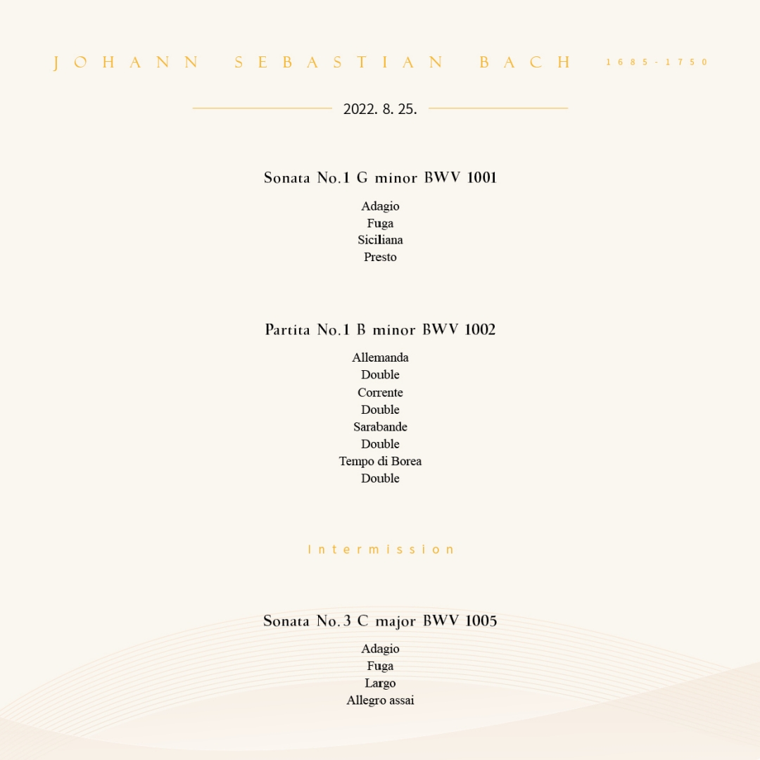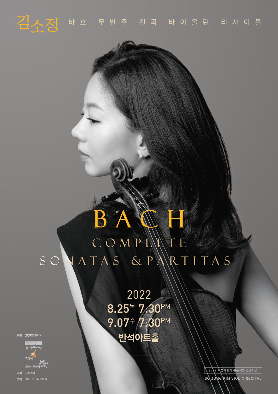 【[공 연]대관공연】[화성예술가활동지원] 바이올리니스트 김소정 바흐 무반주 전곡 바이올린 리사이틀1 장소 동탄복합문화센터 반석아트홀 기간 2022년 8월 25일 ~ 2022년 8월 25일 요일 목 공연시간 2022년 8월 25일(목) 19:30 (소요시간 90분) 티켓정보 전석초대 관람등급 만7세 이상 문의 010-오구일사-3804 . 목록이미지_김소정.jpg [ Size : 304.18KB, Down : 87 ] 미리보기 다운로드 목록이미지_김소정 8.25_Bach.jpeg [ Size : 487.67KB, Down : 92 ] 미리보기 다운로드 8.25_Bach 2022바흐_2(0).jpg [ Size : 146.7KB, Down : 120 ] 미리보기 다운로드 2022바흐_2(0) 목록보기