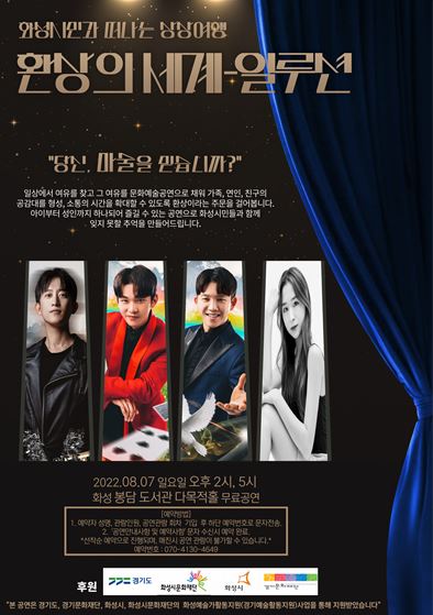 【[기 타] 행사】[화성예술가활동지원사업] 화성시민과 떠나는 상상여행 "환상의 세계- 일루션" 장소 봉담도서관 다목적홀 기간 2022년 8월 7일 ~ 2022년 8월 7일 요일 일 공연시간 14:00시 티켓정보 선착순 무료관람 관람등급 전체관람 문의 070-4130-4649 [화성예술가활동지원사업] 화성시민과 떠나는 상상여행 "환상의 세계- 일루션" 송승호 홍보이미지.JPG [ Size : 51.06KB, Down : 112 ] 미리보기 다운로드 송승호 홍보이미지 목록보기