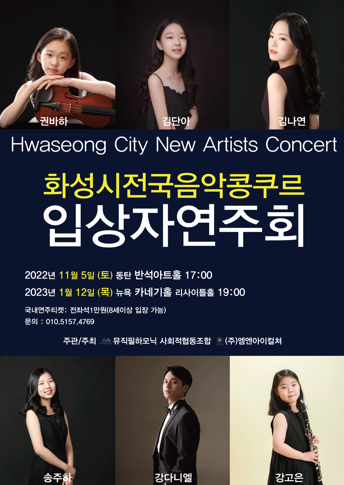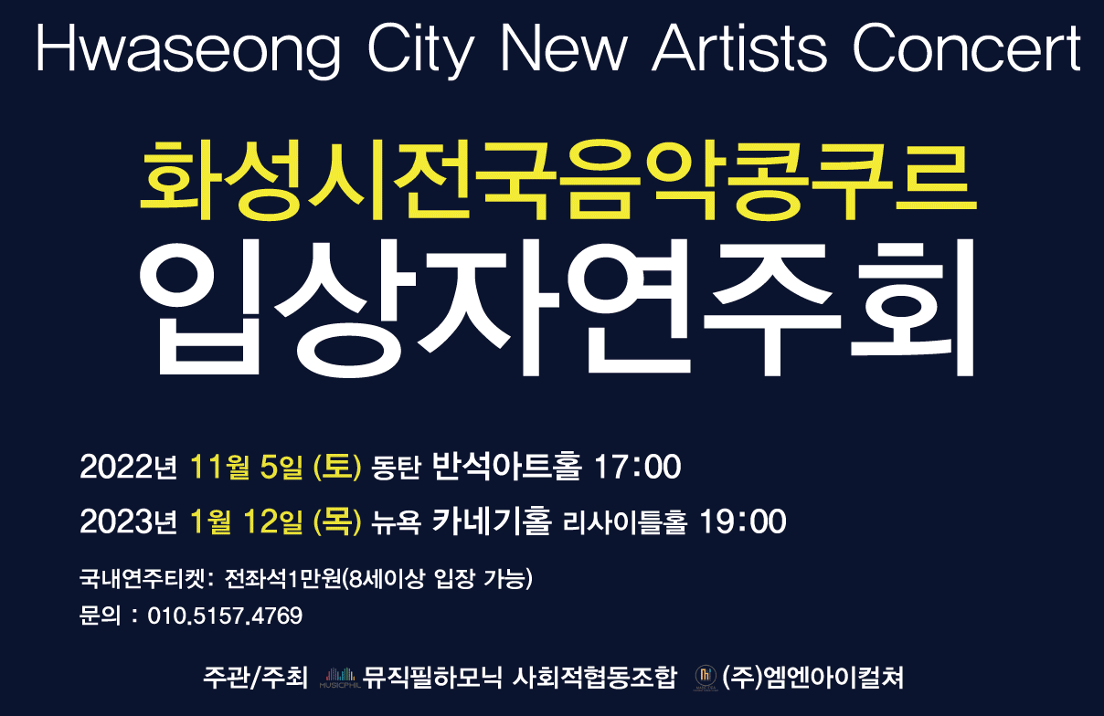 【[공 연]대관공연】화성시 전국음악콩쿠르 수상자 연주회 장소 동탄복합문화센터 반석아트홀 기간 2022년 11월 5일 ~ 2022년 11월 5일 요일 토 공연시간 2022년 11월 5일(토) 17:00 (소요시간 90분) 티켓정보 전석 1만원 관람등급 8세 이상 문의 010-5157-사칠육구 .. 목록이미지_뮤직필하모닉.gif [ Size : 42.02KB, Down : 113 ] 미리보기 다운로드 목록이미지_뮤직필하모닉 2022-입상자-연주회-포스터.gif [ Size : 514.44KB, Down : 127 ] 미리보기 다운로드 2022-입상자-연주회-포스터 목록보기
