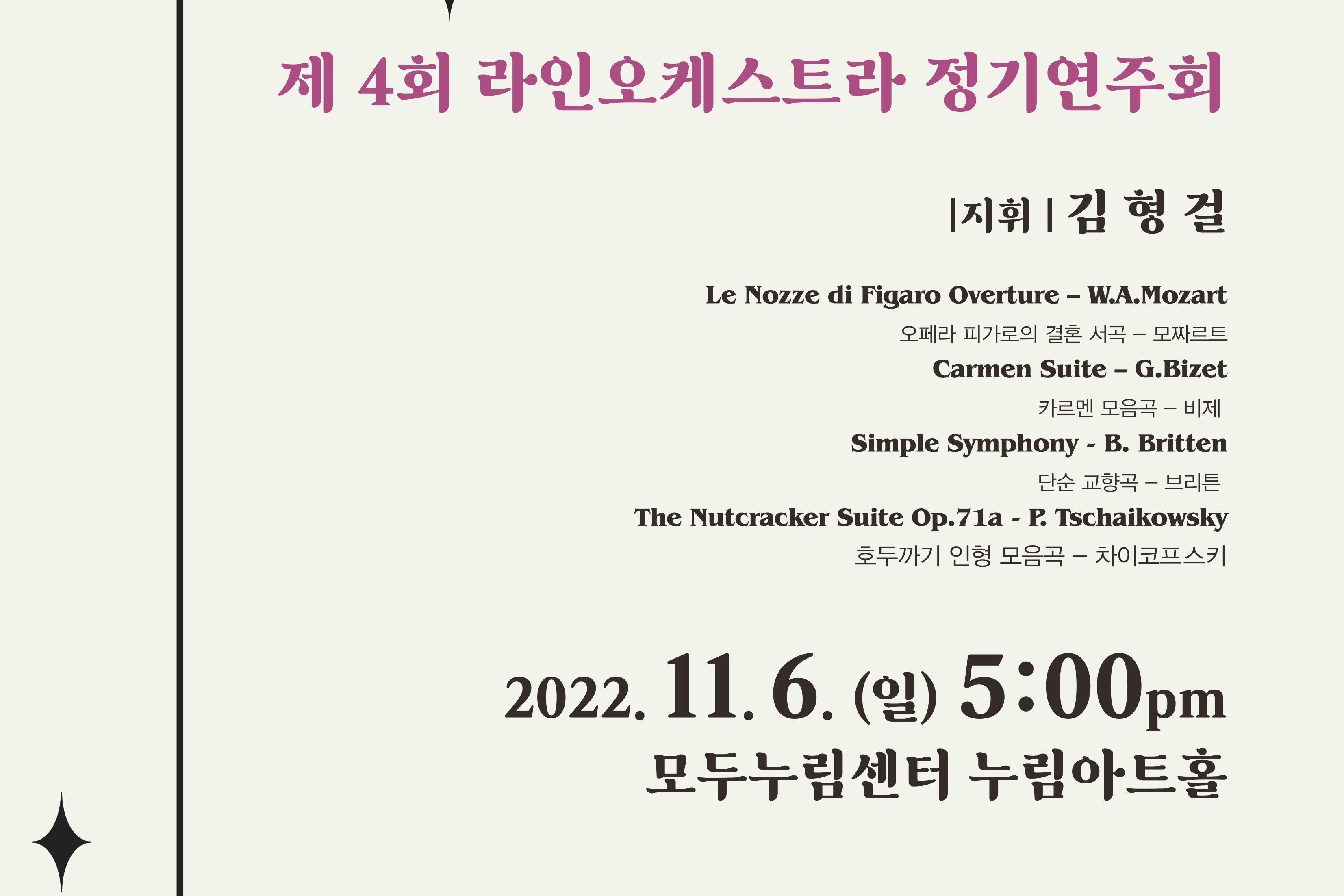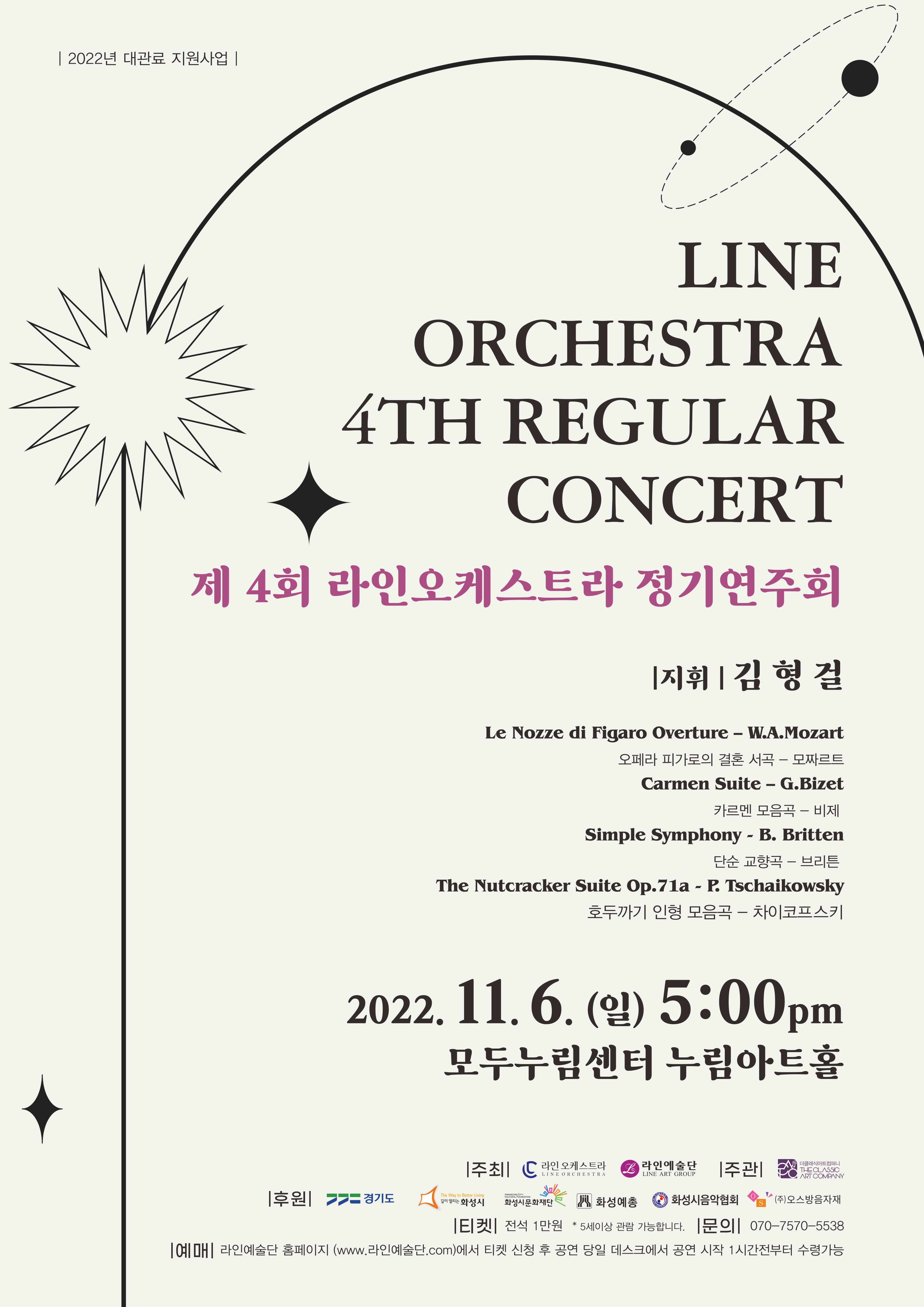 【[공 연]대관공연】제 4회 라인오케스트라 정기연주회 장소 모두누림센터 누림아트홀 기간 2022년 11월 6일 ~ 2022년 11월 6일 요일 일 공연시간 2022년 11월 6일(일) 17:00 (소요시간 70분) 티켓정보 전석 초대 관람등급 전체관람가 문의 070-7570-5538 예매처: 홈 | 라인예술단 (modoo.at) 목록이미지.jpg [ Size : 486.36KB, Down : 105 ] 미리보기 다운로드 목록이미지 포스터.jpg [ Size : 562.42KB, Down : 105 ] 미리보기 다운로드 포스터 목록보기