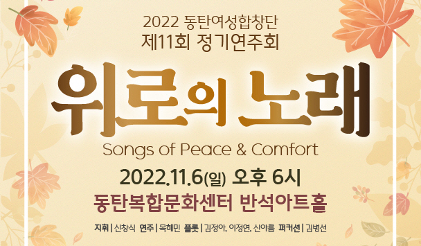 【[공 연]대관공연】동탄여성합창단 제11회 정기연주회 [“위로의 노래”] 장소 동탄복합문화센터 반석아트홀 기간 2022년 11월 6일 ~ 2022년 11월 6일 요일 일 공연시간 2022년 11월 6일(일) 18:00 (소요시간: 60분) 티켓정보 전석 무료 관람등급 전체관람가 문의 010-9810-이일일칠 .. 목록이미지 2022_정기공연 포스터.jpg [ Size : 261.68KB, Down : 97 ] 미리보기 다운로드 목록이미지 2022_정기공연 포스터 2022_정기공연 포스터.jpg [ Size : 527.78KB, Down : 223 ] 미리보기 다운로드 2022_정기공연 포스터 목록보기