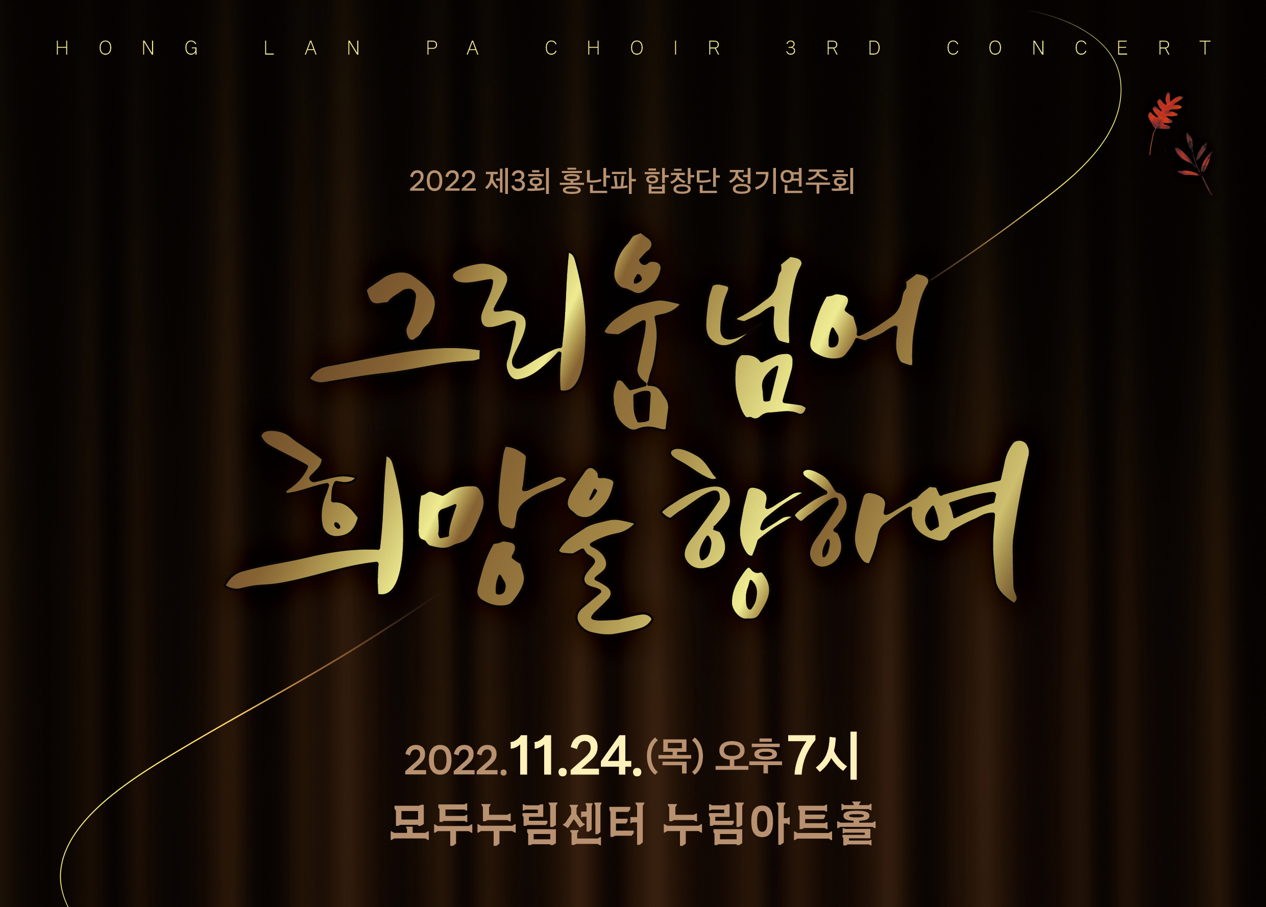 【[공 연]대관공연】제3회 정기 연주회 장소 모두누림센터 누림아트홀 기간 2022년 11월 24일 ~ 2022년 11월 24일 요일 목 공연시간 2022년 11월 24일(목) 19:00 (소요시간 120분) 티켓정보 문의요망 관람등급 7세 이상 문의 031-355-0491, 010-2289-삼사육오 프로그램 목록이미지_홍난파.jpg [ Size : 1.21MB, Down : 74 ] 미리보기 다운로드 목록이미지_홍난파 3회정기연주포스터.jpg [ Size : 3.33MB, Down : 106 ] 미리보기 다운로드 3회정기연주포스터 순서지_홍난파합창단.jpg [ Size : 195.55KB, Down : 239 ] 미리보기 다운로드 순서지_홍난파합창단 목록보기