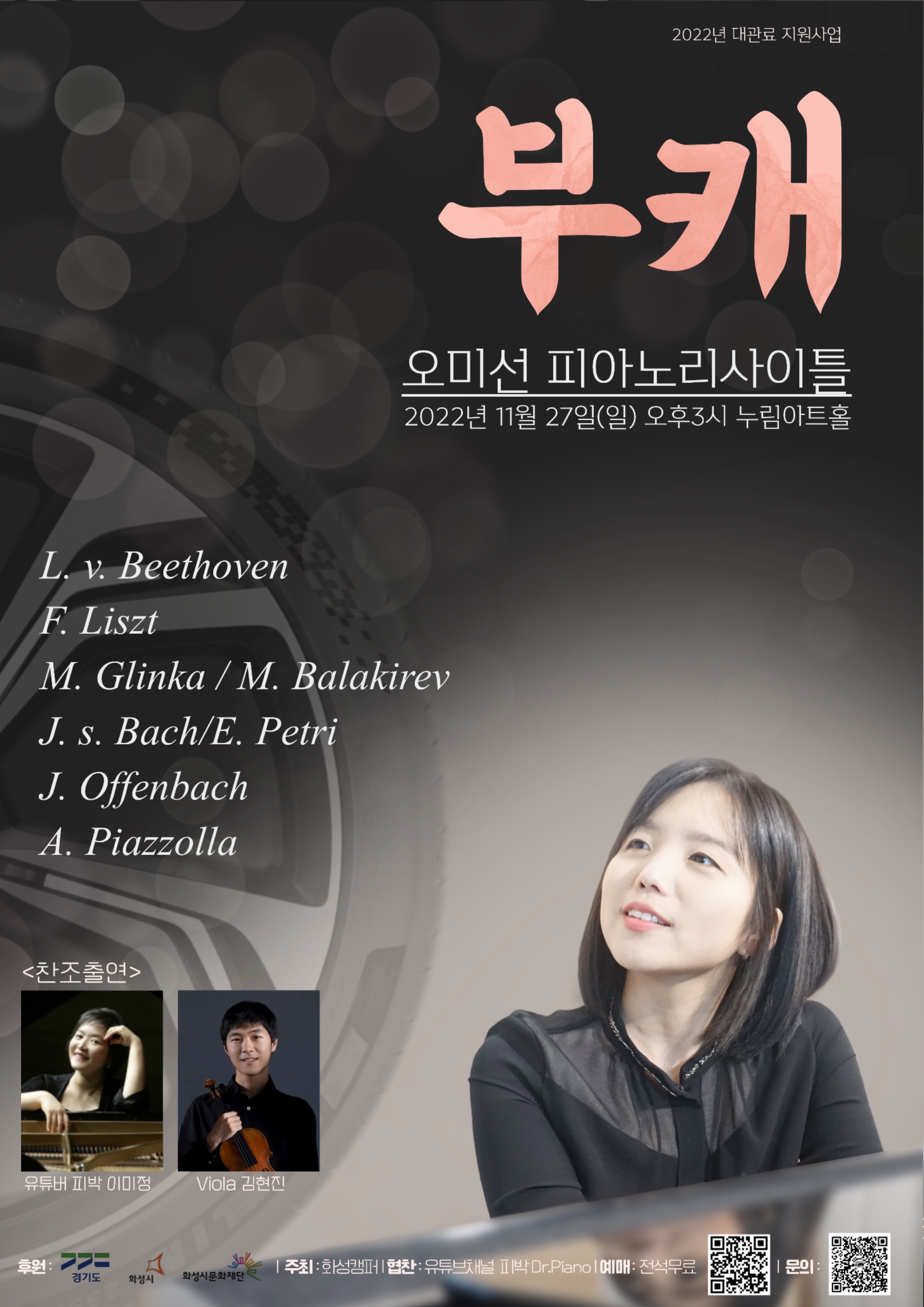 【[공 연]대관공연】오미선 피아노 리사이틀 장소 모두누림센터 누림아트홀 기간 2022년 11월 27일 ~ 2022년 11월 27일 요일 일 공연시간 2022년 11월 27일(일) 15:00 (소요시간 80분) 티켓정보 전석무료 관람등급 초등학생 이상 문의 https://namecard.kakao.com/ohdame 문의 카카오톡 https://namecard.kakao.com/ohdame 오미선 포스터.jpeg [ Size : 763.35KB, Down : 67 ] 미리보기 다운로드 오미선 포스터 오미선 포스터.jpeg [ Size : 763.35KB, Down : 66 ] 미리보기 다운로드 오미선 포스터 오미선 프로그램.jpeg [ Size : 63.3KB, Down : 315 ] 미리보기 다운로드 오미선 프로그램 목록보기